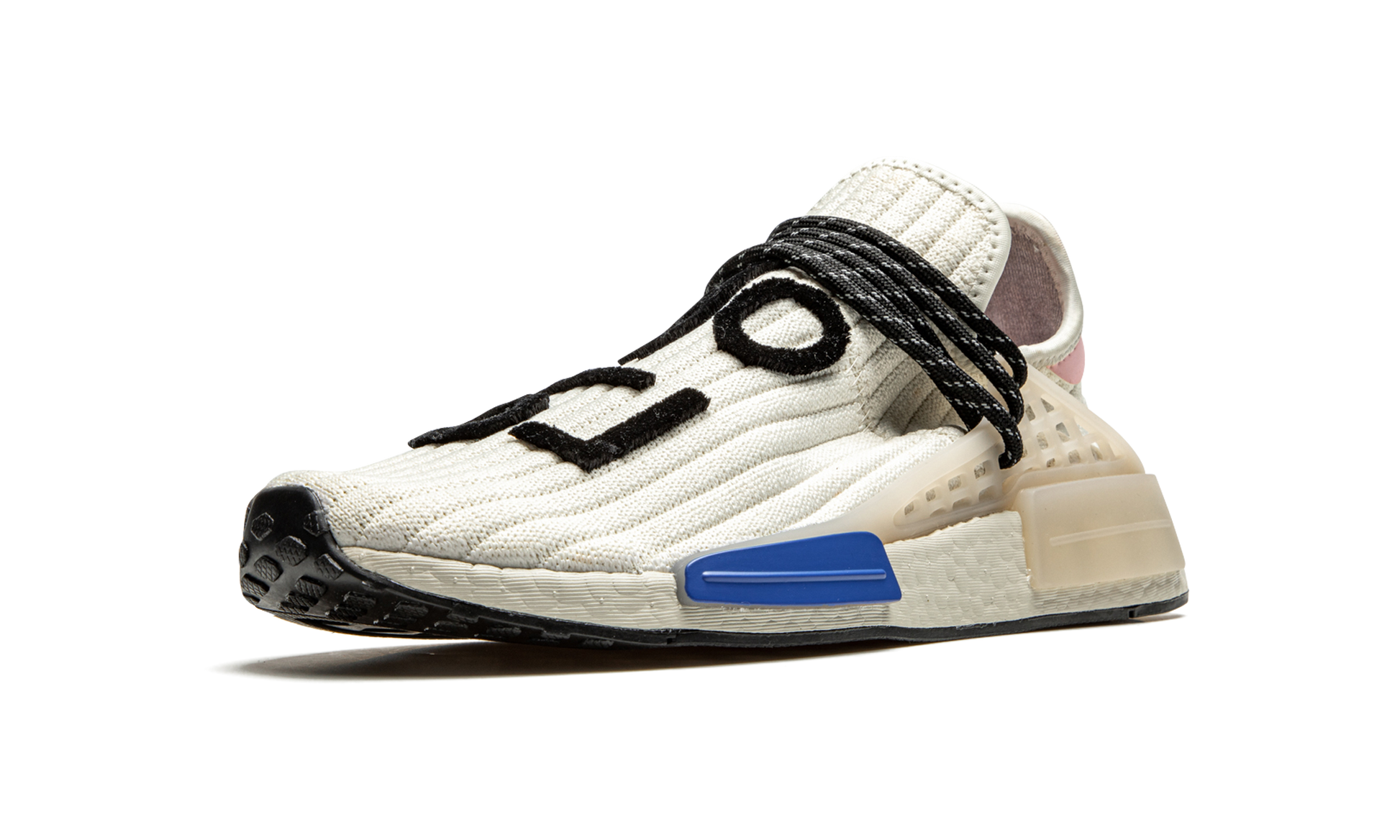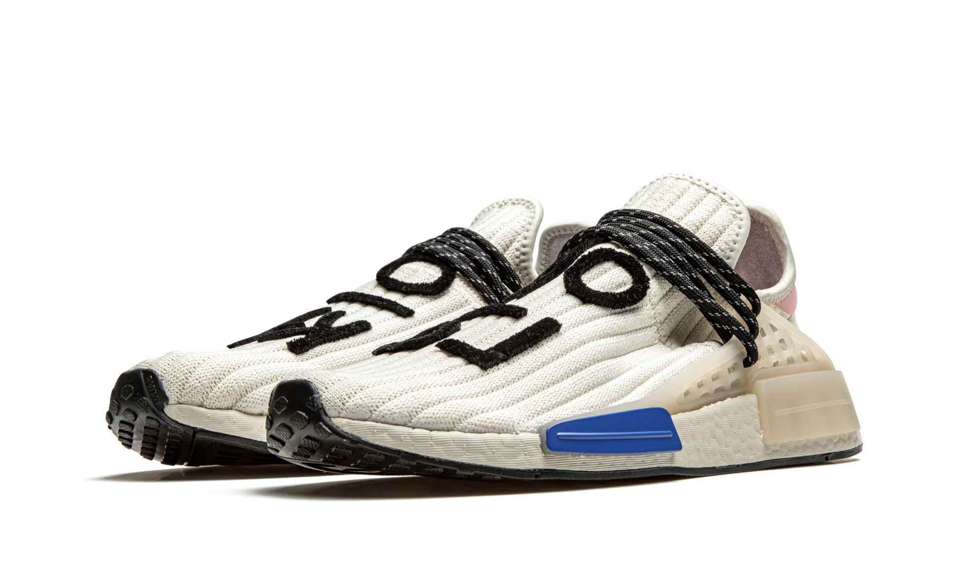 The Pharrell x adidas NMD Hu “Cream” is a February 2021 release of the music artist’s beloved low-top shoe with a reimagined knit based construction. A cream ribbed knit upper replaces the Primeknit fabric found on earlier NMD Hu releases. The sweater-like material is contrasted by a pink leather heel tab with adidas and Pharrell branding. Reflective black speckled rope laces give the colorway an element of ruggedness. Black felt “Human Race” detailing in Korean is stitched onto the top of the shoe. The previously mentioned rope laces are held in place by a semi-translucent TPU caging system that is anchored by midsole inserts. A white Boost foam midsole finishes off the look of this premium offering from Pharrell Williams and adidas. Release date: February 5, 2021. Pharrell Williams - Cream